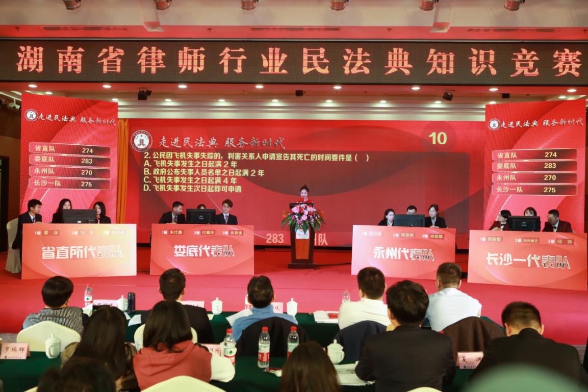 (娄底市律协代表队与邵阳市律协代表队开展友谊赛) 10月31日,湖南省律师行业民法典知识竞赛初赛在长沙市枫林宾馆准时开始。竞赛分为演讲题、个人必答题、抢答题、团队必答题、团队自选题、普法宣讲题、团队风险题七个题型。娄底市律协代表队与省直律师代表队、永州市律协代表队、长沙一队分在D组。经过近2个小时的激烈竞争,娄底市律协代表队以451分的成绩与省直律师代表队晋级复赛,挺近8强。11月1日,娄底市律协代表队与省直律师代表队、邵阳市律协代表队、长沙二队共同角逐决赛资格,省直律师代表队和长沙二队进入决赛。