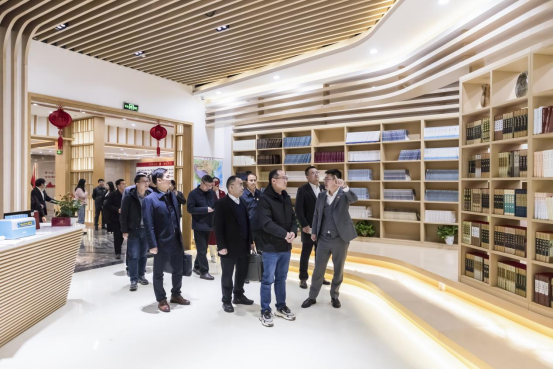 (参观北京市京师(长沙)律师事务所图书馆) 首先,考察团一行参观了京师图书馆、模拟法庭、党建室、京师电影院、律师办公区以及贵宾接待室,北京市京师(长沙)律师事务所执行主任周红文就律所党建工作、规模建设、业务领域、部门建设等方面的基本情况做了简要介绍。